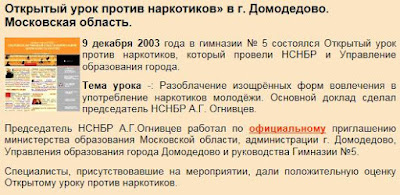 Пресс-служба: Из истории работы председателя НСНБР А.Г.Огнивцева. Открытый урок против наркотиков в г.Домодедово.